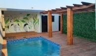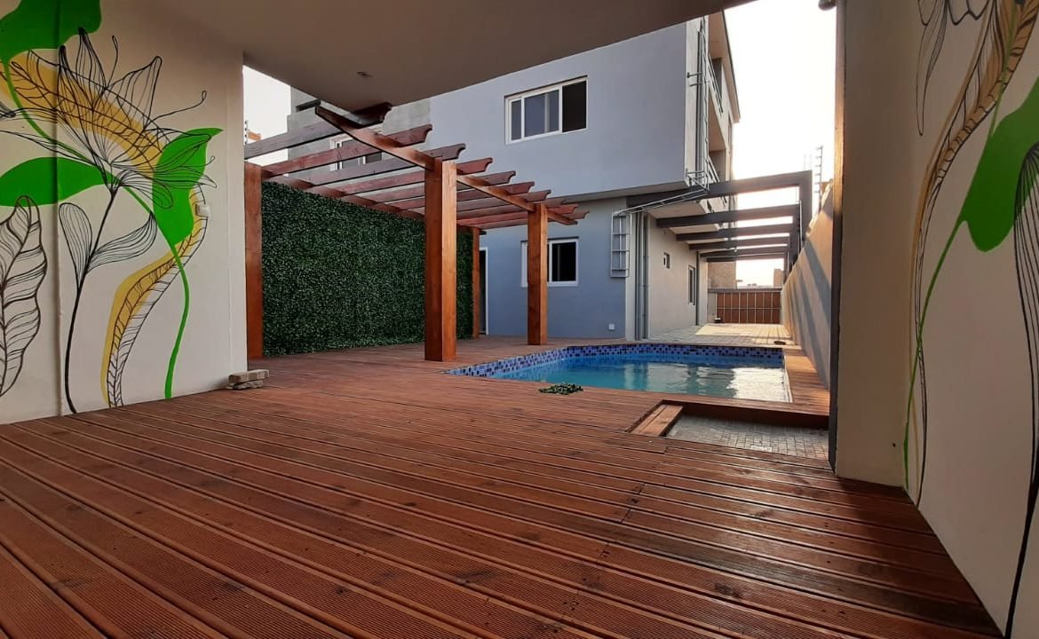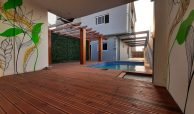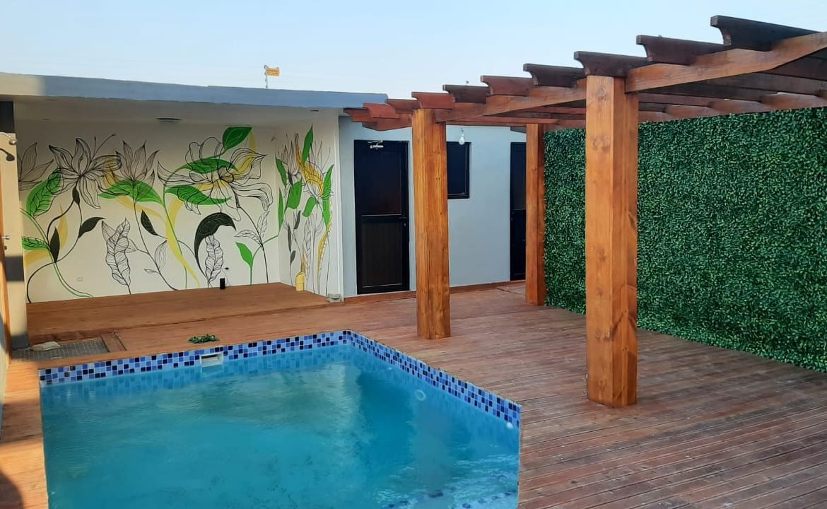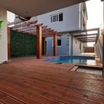 – Piscina com deck de madeira e pergolado